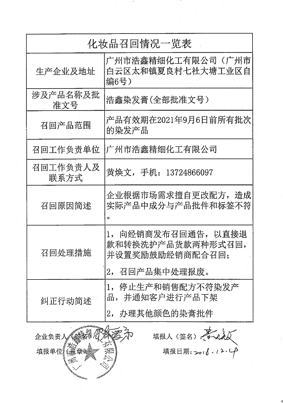 广州市浩鑫精细化工有限公司、广州市采奴化妆品有限公司、广州市艾娜斯化妆品有限公司3家化妆品生产企业因生产不合格化妆品被原国家食品药品监督管理局通报。上述企业已对不合格产品实施了主动召回,但仍有部分存在安全隐患的产品无法完成召回。经企业排查并报告我局,决定对存在安全隐患的产品实施全面召回。现将有关产品信息予以通告,具体内容详见附件。